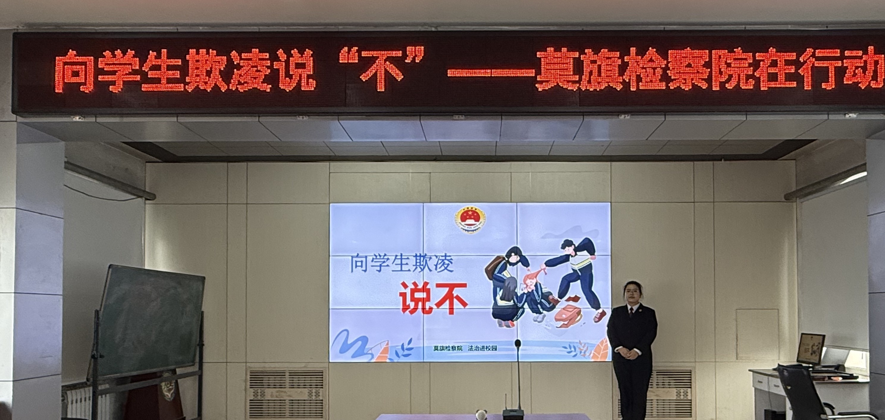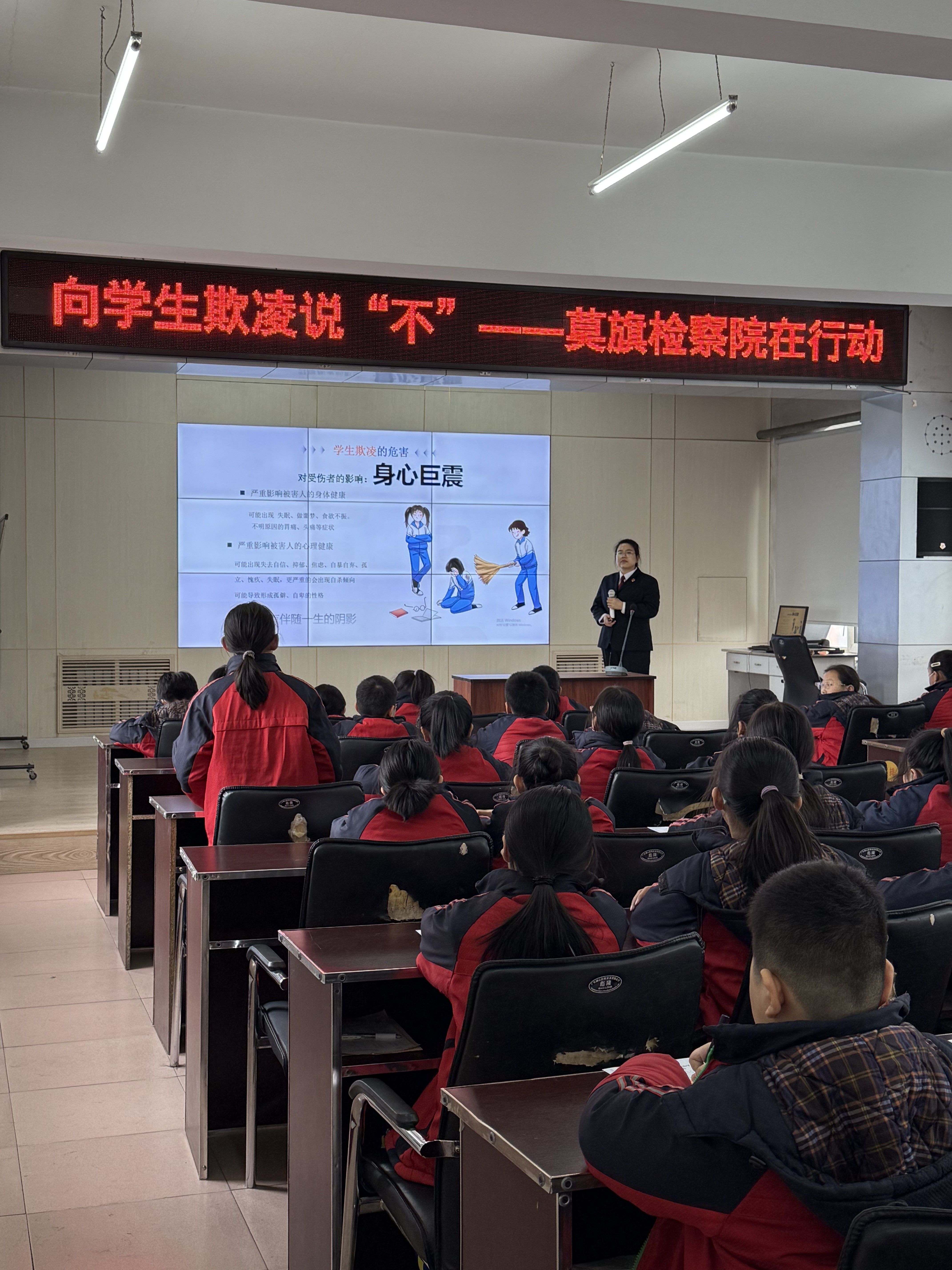 为切实贯彻习近平法治思想,深入落实2025年11月1日起施行的《中华人民共和国法治宣传教育法》的立法精神和核心要义,进一步推动反对学生欺凌精神落地生根。近日,莫旗检察院未成年人检察工作小组工作人员深入莫旗尼尔基第二小学,以“向学生欺凌说不”为主题为学生带来一堂生动的法治教育课。