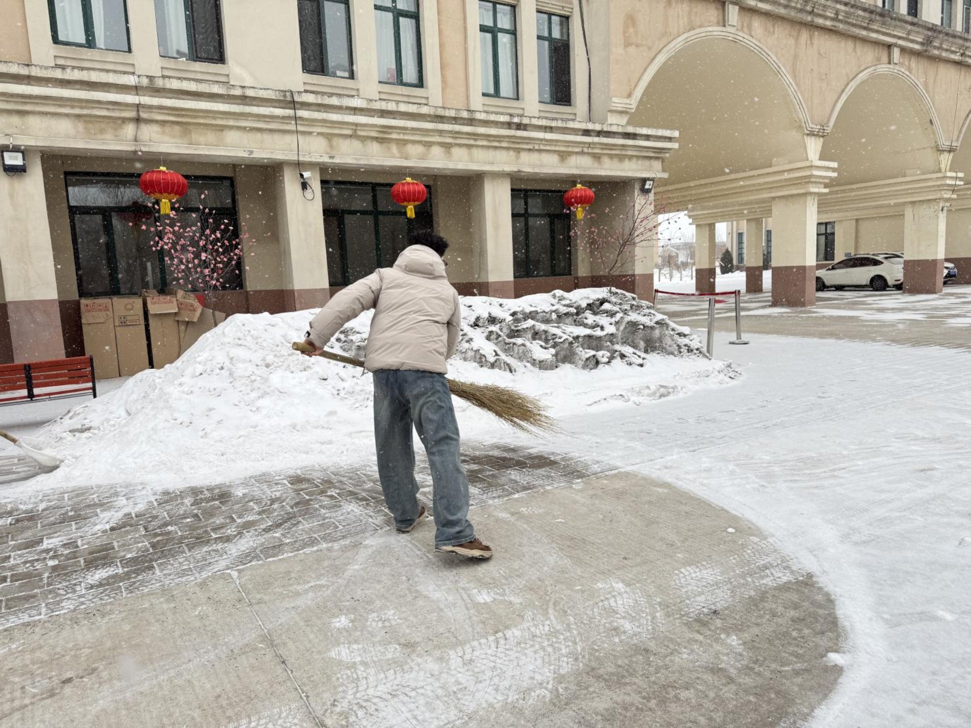 考虑到福利院老人行动不便,志愿者们主动拿起扫帚、铁锹等工具,开展环境整治工作。大家分工协作,有的负责清扫院内道路、擦拭门窗桌椅,有的负责清理院落内的积雪和杂物,不放过任何一个卫生死角。尽管天气寒冷,积雪不易清理,但志愿者们不顾严寒、干劲十足,经过一番辛勤劳动,福利院的环境焕然一新,积雪被彻底清除,院落整洁有序,为老人们营造了一个干净、舒适、安全的居住环境。